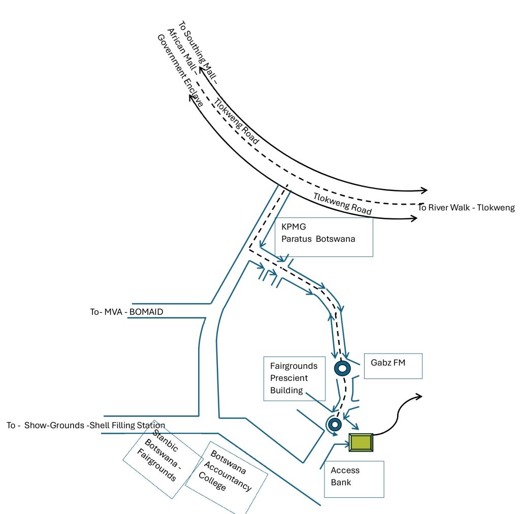 Travel along Tlokweng Road towards Riverwalk. After passing the IDM traffic lights, turn right at the T-junction traffic lights into Fairgrounds. Take the first left after the KPMG Complex, which will be on your left. Continue straight, pass the first roundabout, and turn left at the second roundabout. The entrance to Morula Offices is the first door on the ground floor, on your right.
